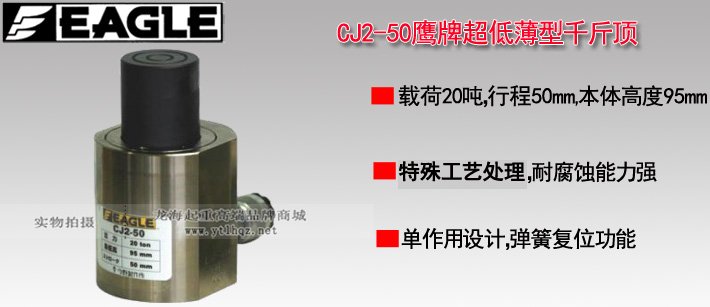 EAGLE JACK CJ2-50薄型液壓千斤頂為日本原裝進口產品,保質1年,我公司承諾凡是客戶在我公司定購的進口類產品均為原裝正品,絕不存在拆件貨,換件貨,假冒品牌產品,凡客戶從我公司定購EAGLE JACK產品如收到貨物時發現有拆件貨,換件貨,假冒、假貨仿貨均以100倍金額賠償。
